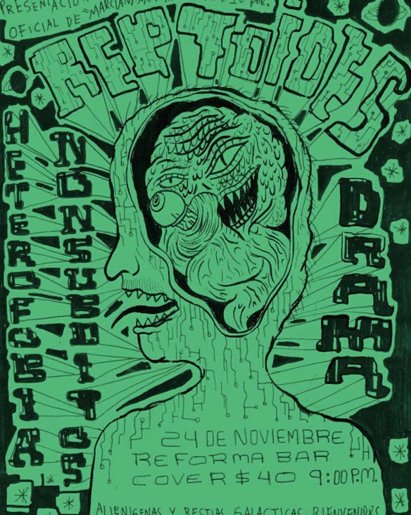 Recuerdo cuando conocí a Reptoides, me pareció que si bien no inventaban nada para el punk, algo había en ellos que me cautivaba. Llegué a esta banda justo con este EP y desde los primeros segundos de ¨Intro (Unete a nosotros)¨, con ese sonido que pareciera proveniente a un rayo láser, mi atención estaba completamente acá. Mientras tanto, para mis adentros dije: ¡a cabrón esto es punk del futuro! Y los tags que acompañan a este EP (punk ufo’s aliens martians reptilians Santa Catarina) no hicieron más que confirmar mi sospecha. El disco compuesto de 6 tracks, de no más de 90 segundos dan un total de 7 minutos de punk, altamente lo-fi inteligible que bastaría para satisfacer a cualquier morro de fundadores.